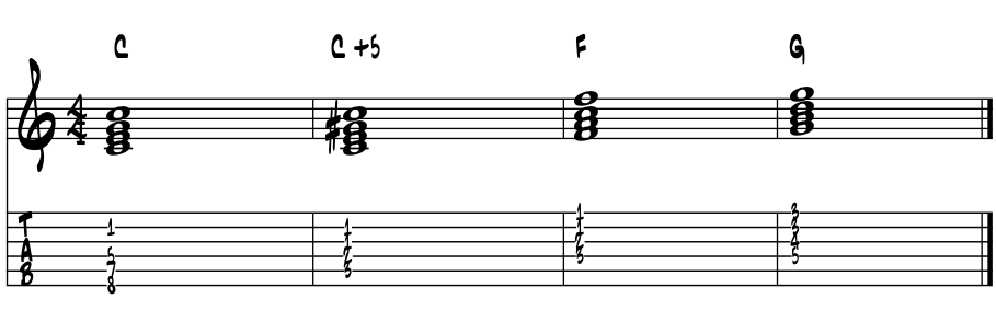 | The augmented 5th. Anytime we augment our perfect fifth we enter into the magical world of the whole tone colors. And while not widely used in any of our styles excepting in jazz, the whole tone color is essential in some very special spots in the music. A most common spot in pop music is the tonic motion to Four via the augmented chord in the major tonality. Here working it in C major. Example 7. |