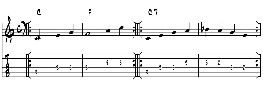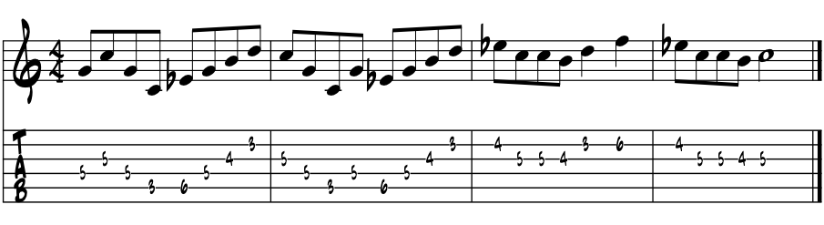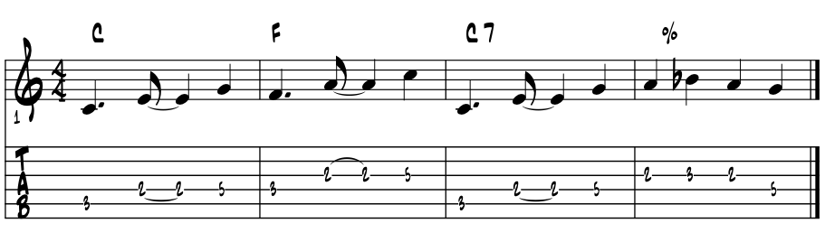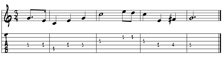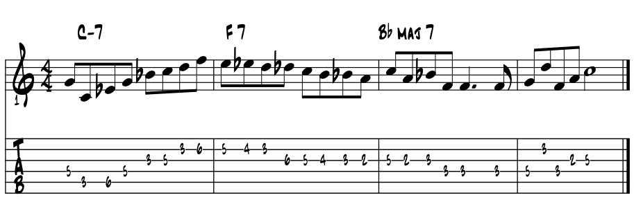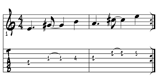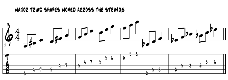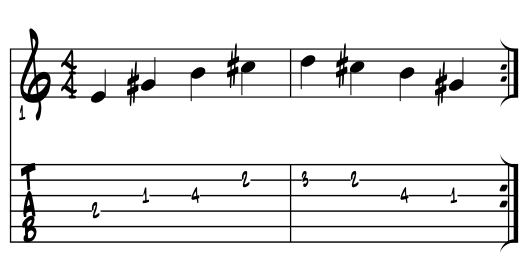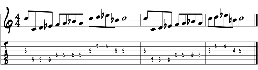 | We can grab this first shape and make a nice little exercise around and across the strings. Listen for the 'changes' in the melody line. Example 3b. |
