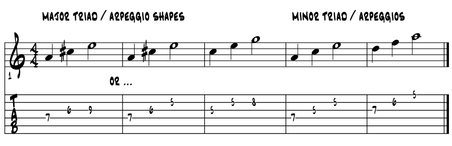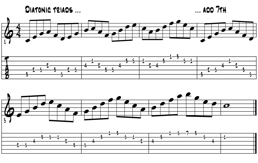 | Triads. Aren't these 'mini arpeggios' triads too? Yep, both are major triads. Add a step to 6 and a 7th to create the cliche that launched a lot of songs. Example 0a. |