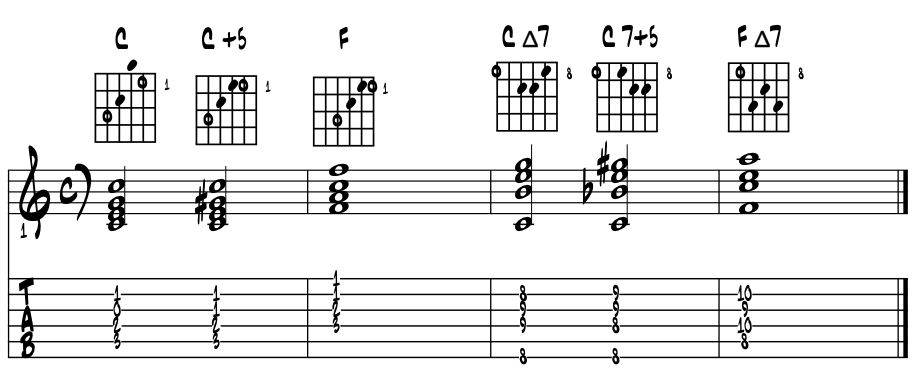 | Where else in the music? We can find the augmented color being used in a major key in the harmonic motion between One and Four. In this next idea, the augmented 5th creates a nice chromatic motion to the major 3rd of the Four chord. I, V7 of IV to IV. Example 6d. |