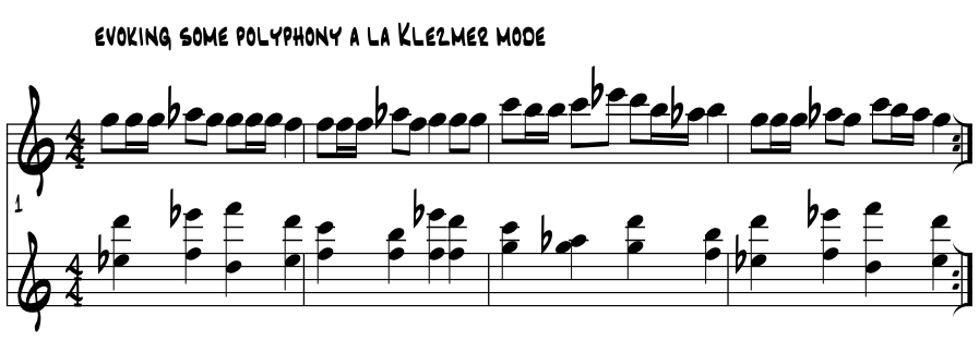 | Some old world exotics eh ? The rhythms help to capture the emotion. What words do these pitches inspire for ya? Hip to the Klezmer library of musics? Talk about ancient, wow, and when done as a sort of polyphony, as in this last idea, ancient wows POP in its historical magics :) Capture the magic and loves of your life in your music. |