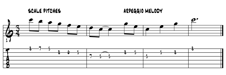| Created from any scale, arpeggios sequence a scale's pitches by skipping every other note, thus becoming the pitches of chords one by one. In the following idea, we sound out the 'C' major scale followed by arpeggiating the pitches of the 'C' major triad, in a linear, 'broken chord' shaped melody. Example 1a. |