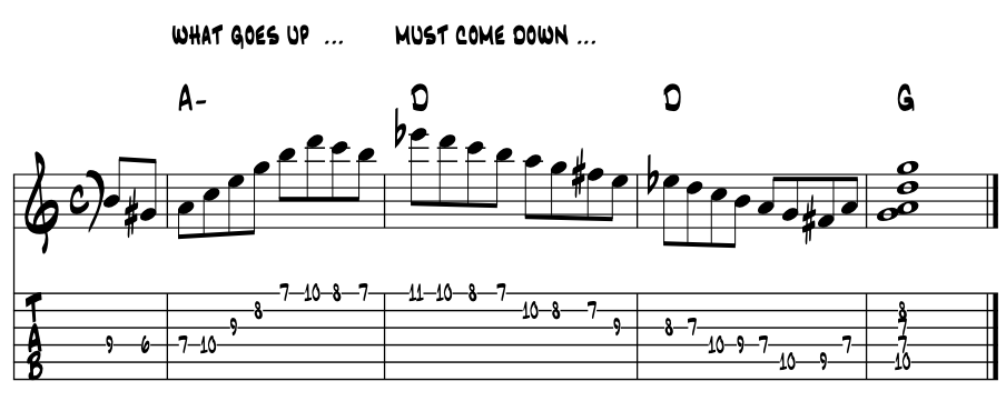 | Jazzy nutshell. Just turns out that even in music, that what goes up must come down. Gravity? Yep. So there's musical pitch gravity too? Yep. Like a tonal gravity? In some circles, yes, indeed. So within this next discussion of our melodic essentials, generally what goes up are the pitches shaped into arpeggios, and what comes down are pitches shaped in scales. Arpeggios become the launch energy for our idea, and we insure a safe landing, by scale stepping our way back to diatonic terra firma. Example 1. |