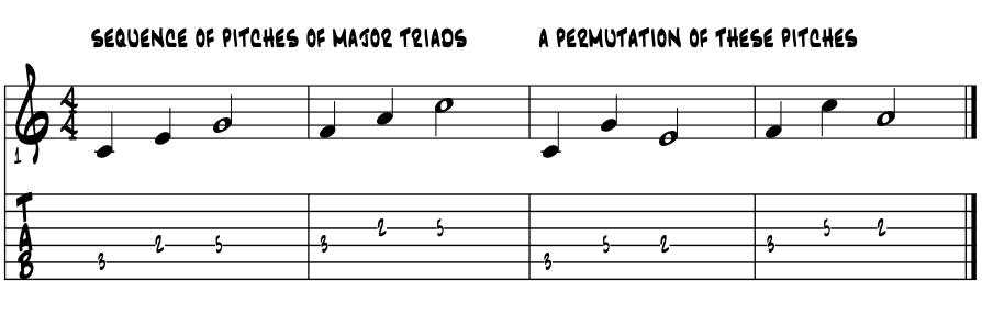 | For improvising musicians, these two techniques become mainstays for creating our variations of whatever motifs we're given to work with, from any song or musical setting. Musical elements that are sequenced can be permutated. Improvising artists 'sift through' ideas, find their gems, and filter them through various forms and patterns. Please examine the following idea of major triads. Thinking 'C' major. Example 1. |