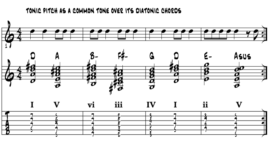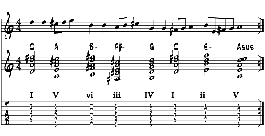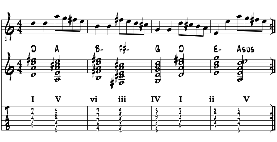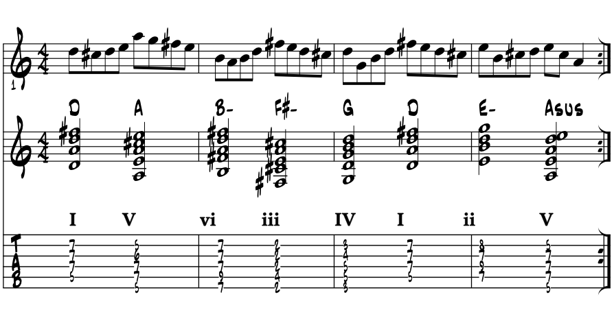 | A Baroque sequence. This next idea comes to us from a couple of hundred years ago now, from an era of stately sounding, majestic music whose composers just love to sequence a bass line, chord changes and create 'written out' orchestrations and permutations in the lead lines. Click the music. Do you by recognize this Euro 'top 10' hit from the early 1700's ? It's become a winter holiday classic, still to this very day. In this first pass we use an upper pedal for our melody. Without a key signature, thinking in 'D' major. Example 2. |