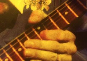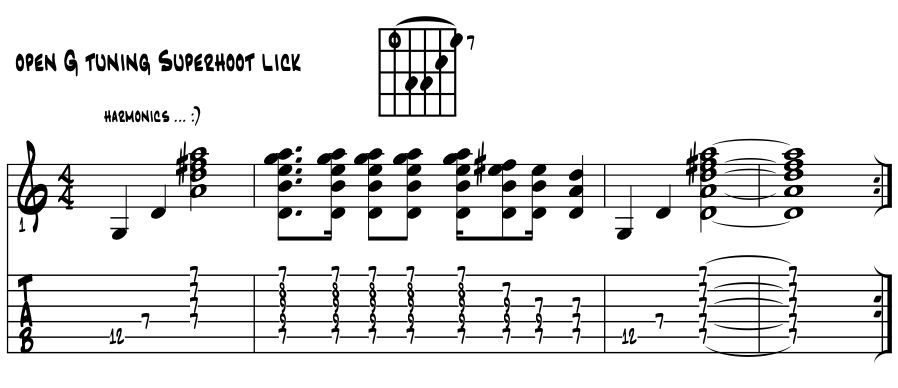 Here's one last 'open G sus' idea and it comes from the Superhoot library. There's a cool harmonic at the 12th and 7th frets to kick it, off then the 'core of them all' chord shape and roll em' off pitches borrowing from the same open 'E' chord shape from above. Watch fret numbers close as this is tricky but you'll hear it right off when sounded correctly. Eventually the tune is just a basic vamp between 'D' chord and 'C' chord, with some additional colors etc. Mostly spoken word vehicle with this as the riff / chorus to the verse. Example 9g. |