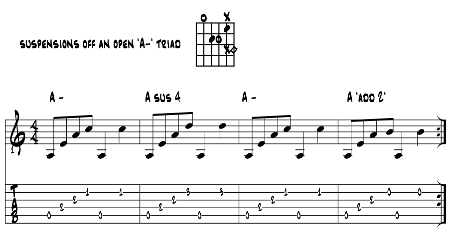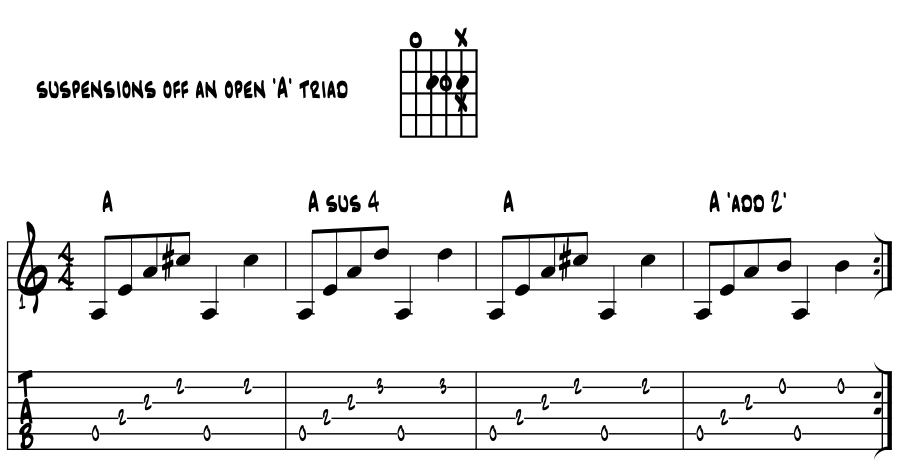 Suspensions with an open 'A' chord. Moving up a perfect 4th from 'E', let's look for the suspended coolness we get with the open 'A' chord. An easy 'chunk' for intro's, examine the scale degree letter name pitches, voicings and numerical suspensions. Easy 'encapsulate' for the 3rd with 'sus 4' and '2' in this next idea, grab a quick strum and make it all go :) Example 3. |