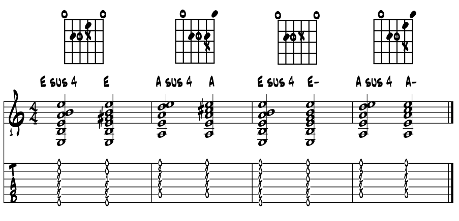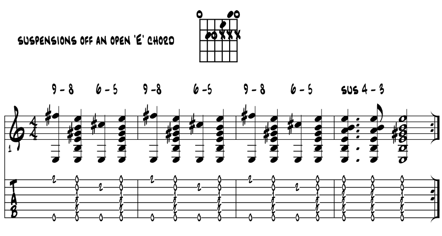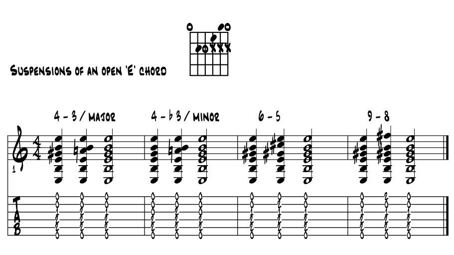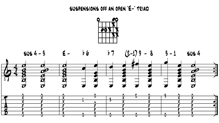 Suspensions in the open chords. With the open chords, we get to sound most of our six strings to create the major and minor triads. And while all sorts of colors are available, the suspensions sound very powerful in this open string context. Same theory works on any triad of course and also both in standard and open tunings. Examine the following open chord shapes, their nearby suspensions and other local coolness. Most is the '4 - 3' but look for a few others too, especially minor. Please examine the letter name pitches and common suspensions with the 'open E' chord. Got this one under your fingers? Example 2.