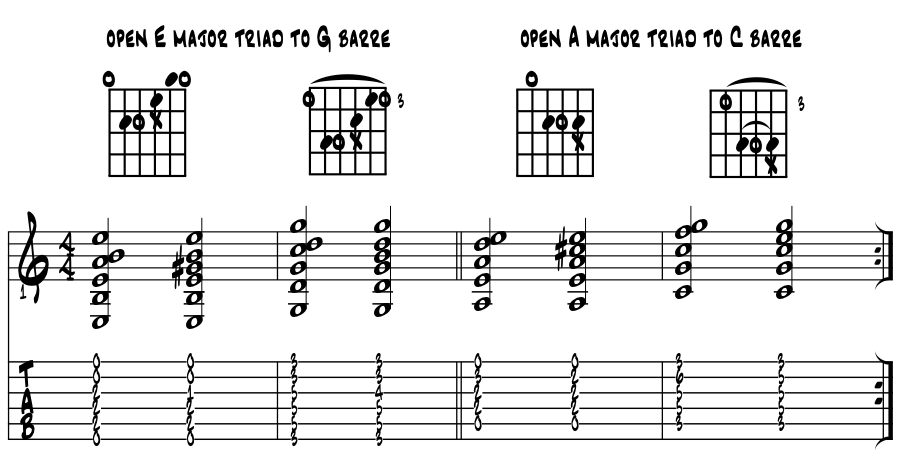 These totally 'epic' open chords are the two main shapes for making the barre chords of the 1960's yes? Sure are. Here's the mighty '4 - 3' all barred up. Example 9c. |