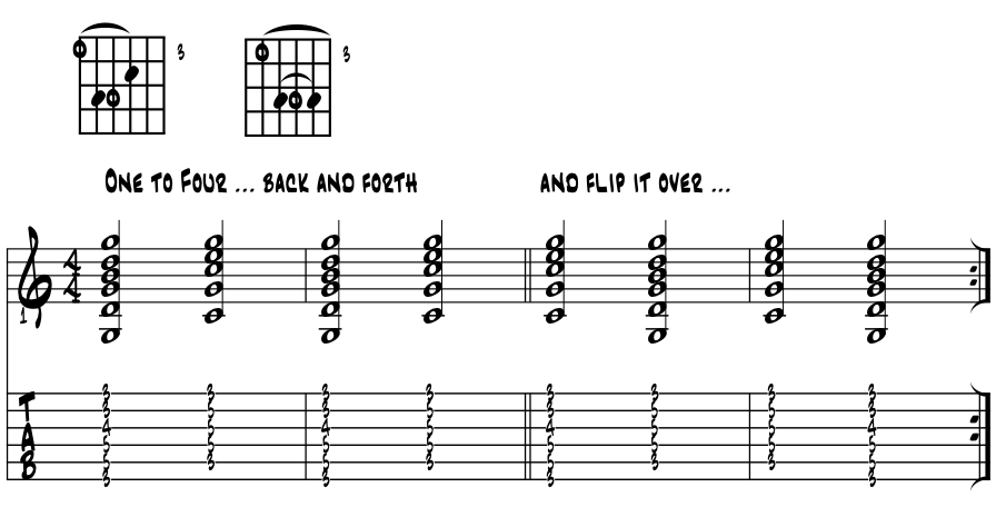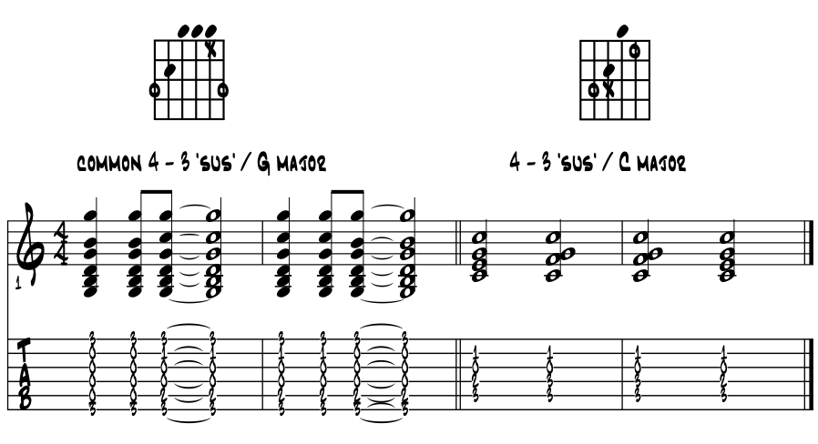 Open 'G' and 'C', two more keepers. Saving some max coolness for last, the open 'G' and 'C' chords just might be the most popular of the open chords. These shapes create the quite common '4 - 3 sus', using their basic open chord shapes. Please examine their letter name pitches by scale degree and resulting sounds. Example 5. |