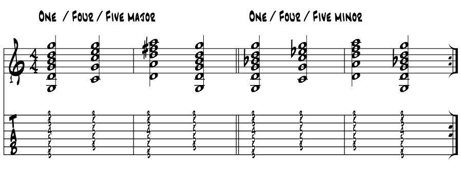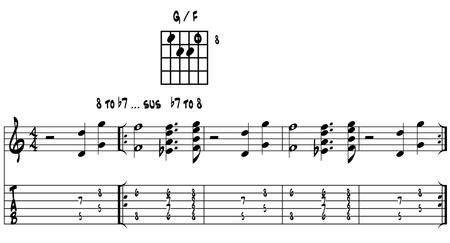 Last idea here. Same shapes as above but molded into the One / Four / Five chord progression for a song in a major key then a minor key. Find the hidden 'sus' colors within. In 'G.' Example 6b. |