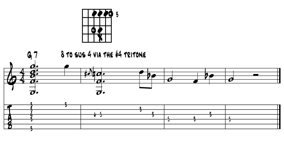 A most common blues 'sus.' Here's a super cool and fairly common blues suspension with the blue 7th going up to the tonic pitch, thinking blues in 'G.' Example 10. |