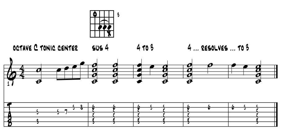 As artists here, initially we simply want to learn how the suspended notes feel, be able to recognize by ear and numerically label the ones we commonly use through the whole fabric of our Americana styles. Here's two melodic ideas to capture the 'suspended pull' of the tonic pitch. Thinking 'C' major. Example 1. |