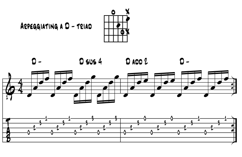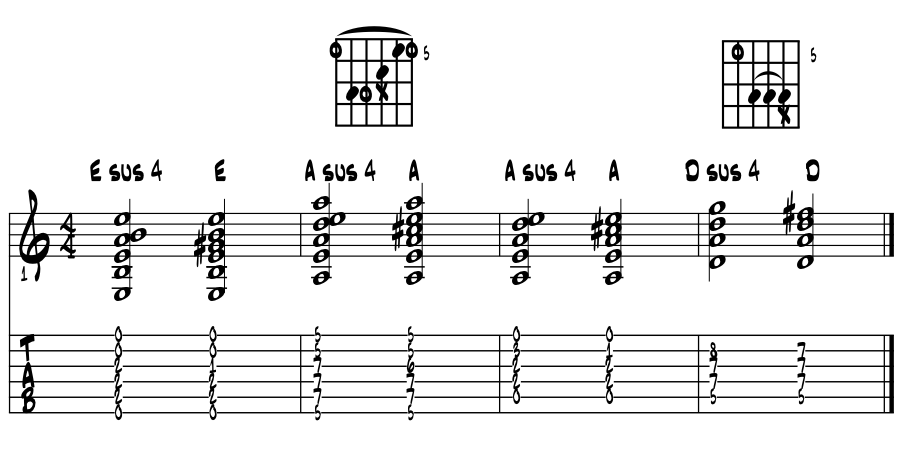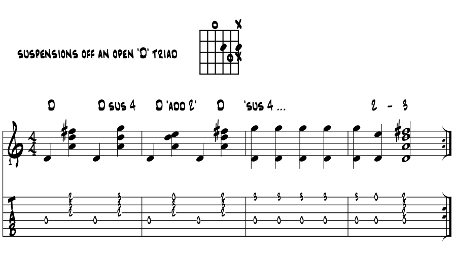 Suspensions with an open 'D' chord. Moving up a perfect 4th from 'A', let's look for the suspended coolness we get with the open 'D' chord. This bright and cheery critter 'susses' out beautifully and can light the room up with just a strum or two. Example 4. |
