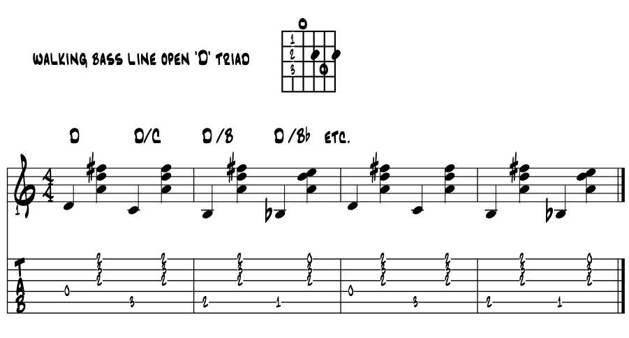 Nice 'walkdown' suspension with an open 'D' chord. This next idea walks the bass notes down to create a nice four bar pattern. Fairly common, try it a couple of times and if you dig it, then learn it here if need be. Example 4a. |