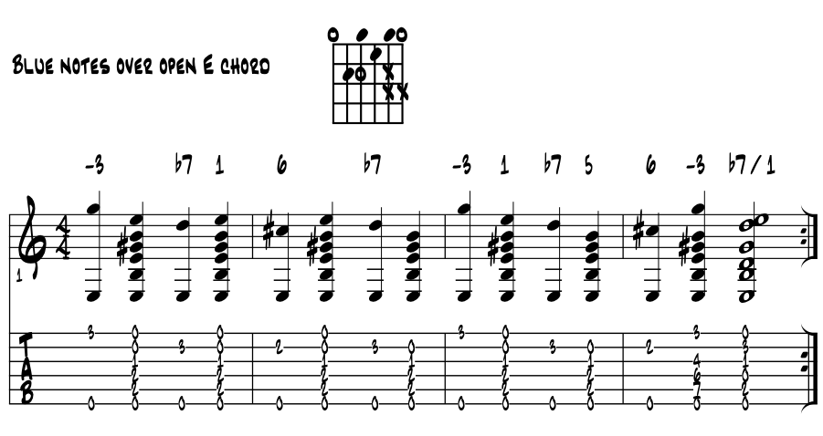 Some of the blues hue / open 'E.' Same sort of idea here but sounding off some blue note suspensions with open chord support. Examine blue note pitches over an open 'E7' blues chord in a four bar lick. Example 2b. |