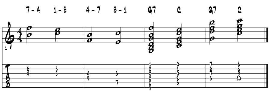 So, thinking 'C' major and the pitches are 'F and B.' Interesting that the interval between these two is a tritone; a core of our tension and release dynamic easily found in most musics. The 'F and B' part of V7? Yep, 'G'7 same one. This can be a spark that lights the fuse to kaboom; to a better understanding your music. Explore. In 'C' major, and thinking from the root. Example 8b. |