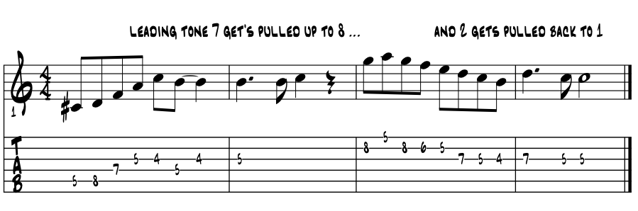 Hear and feel the pull towards the resolution to our tonic pitch 'C?' Cool. Seven just 'waits' a bit before moving on up move up to Eight. In the descending line, we get to Two, and just hold up a bit till One arrives. These melody's words could be like, 'only ... you.' :) |