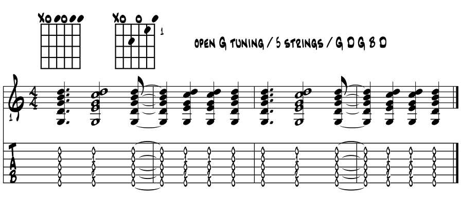 Same 4-3 in open 'G' tuning. Same 4 - 3 sus ideas in open 'G' tuning. Just way too easy to not have a full time grasp of this old oldtime magic from our earlier banjo playing days. Start me up :) Example 9e. |