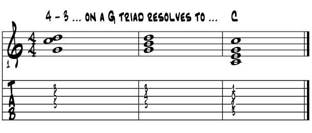 Another most common ~ Four / Three :) Easiest to hear and sense perhaps, and also probably most common over our wide range of styles, is the chordal the '4 - 3' suspension on really any single chord. Available both in major and minor key centers, we just delay the impending resolution to the 3rd of any chord. Let your creative sound the 'epic' and begin anew. First in 'C' major, examine its descending letter name pitches sounds. Example 9a. |