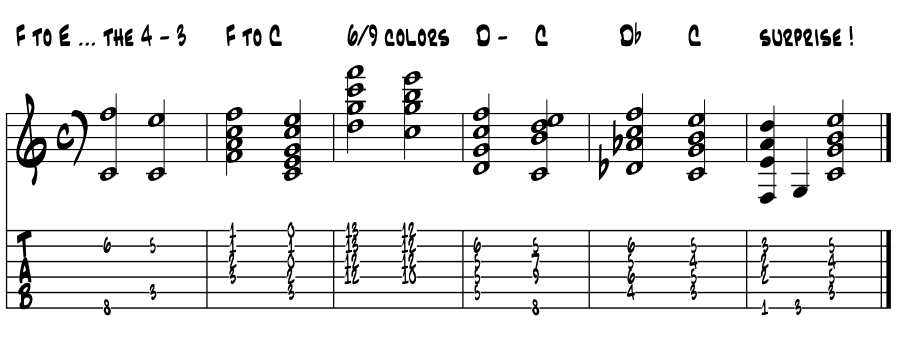 Sort of a 'Dust In The Wind' quality yes ? If you be a folk leaning artist, work over these open shapes and suspensions, looking for your own coolness with these now ancient colors. Once you find a pattern that fits your chops and liking, polish it up and have it forever. Chances are you'll use it again and again over time. Oh, and what's with that 'diamond 'G?' in the chord shape? |