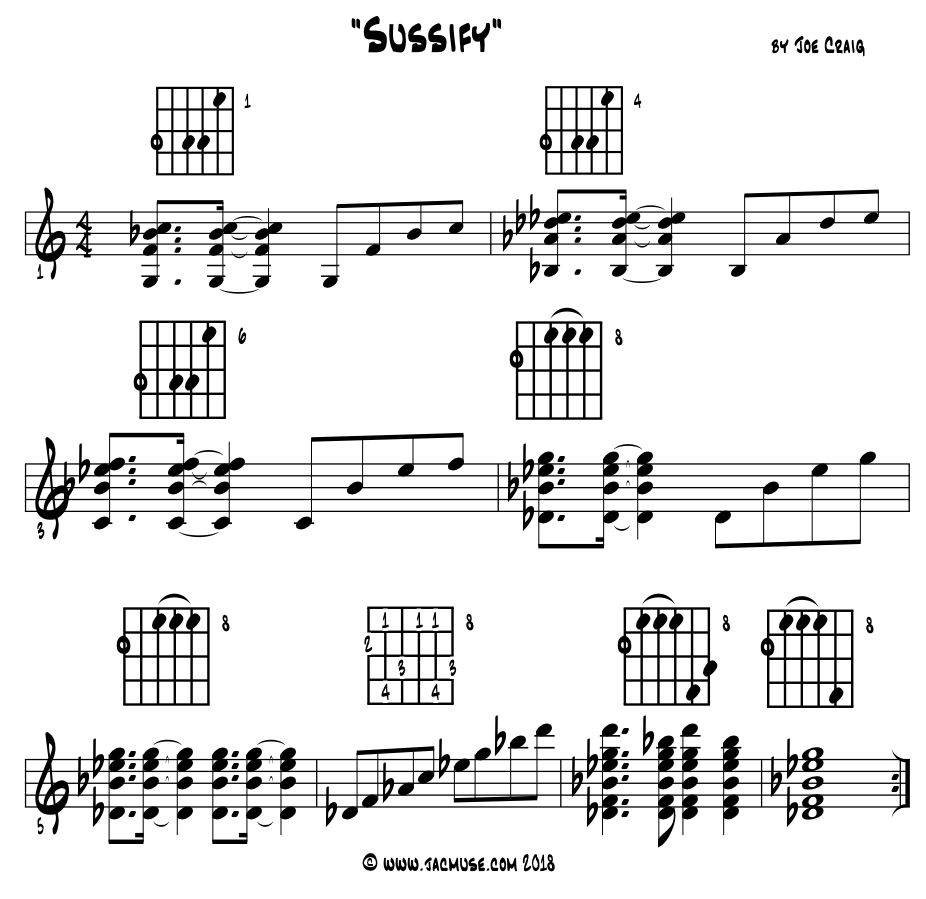A nutshell of 'suspensions.' The idea of a 'suspension' or to 'sus' in our musics is just as this word implies; we're looking to suspend the energies of whatever elements we're working with, most often retaining the steady rhythm / time of the moment of the music going down. We're still moving through time but now we are suspending or sustaining an aural element or two towards its breaking point of tension. Not always really, but sometimes we do, and to 'sus' or 'sussing' gets us easily there. With a dozen 'sus' options, plus the blue notes, there's a million ways to bring the 'floating' sorts of energies that any suspension will provide while moving through time. Most any musical element's suspension is simply to create a 'pause', a 'hold over' of a note, rhythm, chord, lyrics, of everything and anything really, along the way in telling our stories with music. And as with near everything in our creative arts, the length and degree of a 'pause created with a suspension' can last from a beat or two to a complete suspension of the energy, forward motions and resolutions of an entire song. |