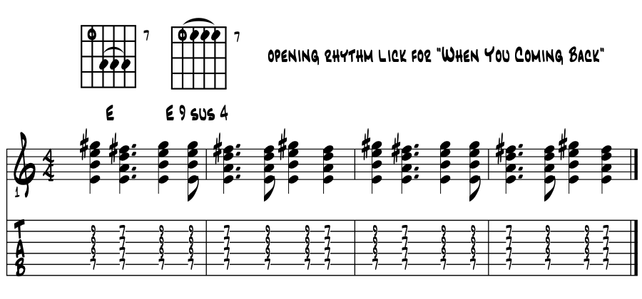 Moving off the 4-3 suspension for a moment for the big rockin' sus intro for "When You Coming Back." Reducing things down to just the one barre shape and letting the guitar work the magic. Big chance for the motor hand to rock the house. Example 9d. |