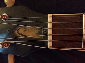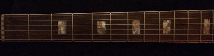 | The dots. In writing this, multiple queries revealed a continual mystery as to why the dots / fretmarkers are located where they are on the neck of our modern guitars. Looking at available pictures of older guitars from various sources, there is some variability in placements. Some cats even add additional dots for super lightning quick references. So thinking of what was the oldest song we have that is consistently found in modern collections written in the same key centers, and upon examining the instruments I had at the time, the following solution occurred to me. The English song "Geensleeves" takes us back near the mid 1550's or so before our six string guitars really got their start. Modern scoring of the song finds it mostly centered in the key of E minor with the bridge / refrain going to G major. So in looking at the fret markers on my guitars, the corresponding pitches create E Dorian and G Lydian. In today's theory, these are parented by the D Ionian / D diatonic major scale. While even the lutes of this era are said to be equal temper tuned, thanks to their fret placement by the rule of 18', good chance that the modal system of pitch organization still ruled the day. Am I way out of my league here? Absolutely, but who doesn't love a good mystery :) Here's a picture of the first octave of my old guitar. |
